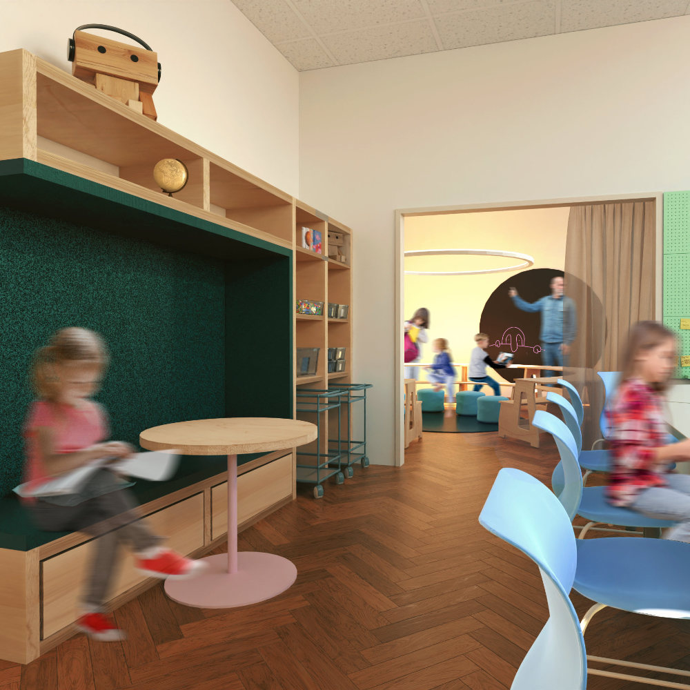 Eine durchdachte Zonierung unterstützt Lehrkräfte und Mitarbeitende darin, die Raumstruktur optimal zu nutzen und pädagogische oder organisatorische Konzepte umzusetzen. JUNI.STUDIO verbindet dabei funktionale Anforderungen mit ästhetischen Gestaltungsprinzipien, sodass die Räume klar strukturiert wirken, aber dennoch Offenheit, Bewegungsfreiheit und kreative Nutzungsmöglichkeiten bieten.